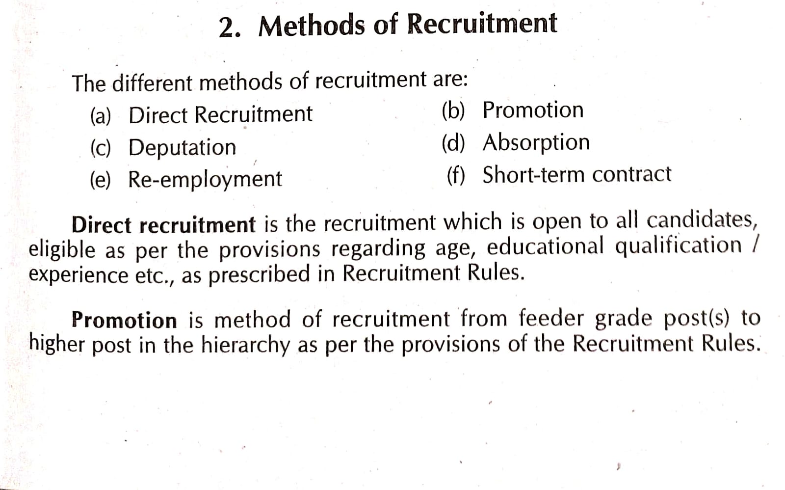 Absorption occurs when a deputed employee is permanently appointed to a post. This method is used when the organization finds the officer suitable and the rules allow it.